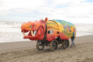 In my Humboldt bioregion we have the Kinetic Sculpture Race where dozens of bicyle-driven human powered sculptures must prove themselves capable of traveling over sand, water and many miles of roads. It isn’t hard to imagine this fleet of bike vehicles shared, rehabilitated and helping to move goods and people around the North Coast.